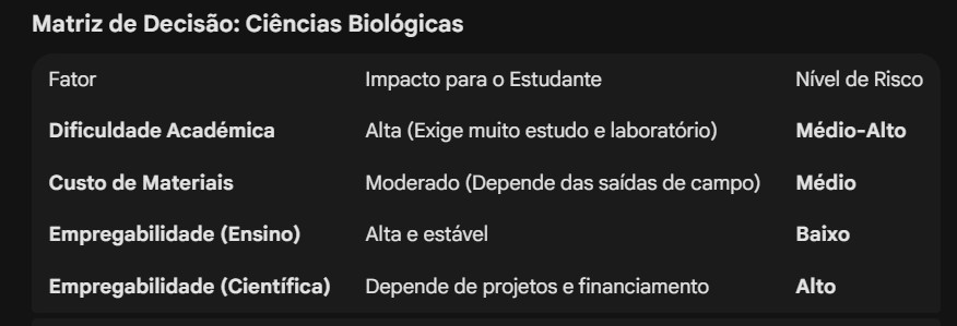 Se você entrar em Biologia mas tiver medo do desemprego, tente focar em Biologia Aplicada (como Entomologia Médica ou Microbiologia). Estas áreas têm ligação direta com a saúde pública (combate à Malária, Cólera, etc.), onde o financiamento internacional é mais forte.